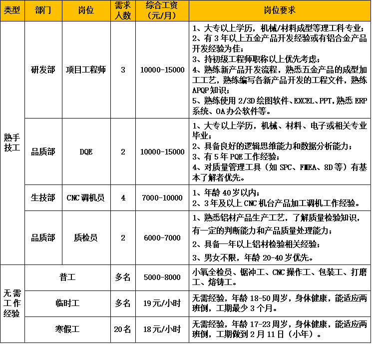 公司擁有廣東省唯一的鋁車(chē)體工程技術(shù)研究中心!扳伱冷X材”品牌先后獲得鋁型材行業(yè)內(nèi)的最高榮譽(yù):“中國(guó)馳名商標(biāo)”、“中國(guó)著名品牌”、“中國(guó)名優(yōu)產(chǎn)品”;公司榮獲“國(guó)家高新技術(shù)企業(yè)”、廣東省“專精特新”企業(yè)等榮譽(yù)稱號(hào)。因生產(chǎn)發(fā)展需要,誠(chéng)聘以下崗位: